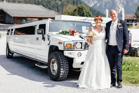 Nach der Trauung überraschte eine elegante Stretch-Limousine die Hochzeitsgesellschaft und brachte das Brautpaar stilvoll von Jenbach nach Pertisau. Ein kurzer, aber besonderer Moment auf dem Weg zur nächsten Etappe – entspannt, mit Sekt in der Hand und strahlenden Gesichtern.